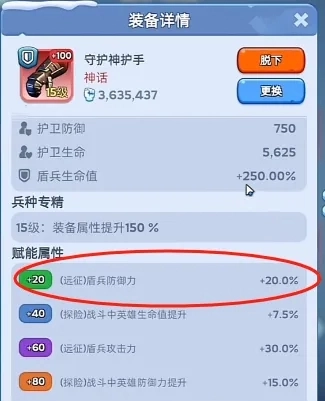 2、关于赋能的先后顺序,首先护手要先升到19级,之后再开启20级的赋能。需要先享受护手带来的盾兵防御力+20%的效果,腰带没有这个防御加成,它加的是盾兵攻击力。不过为了提升盾兵的整体生命值,这两个部位的赋能都得进行突破。