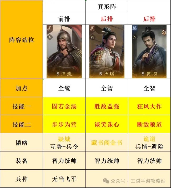 这一队里徐盛在前排承担伤害,贾诩主要负责施加debuff,周瑜是核心输出点,因此周瑜得带胜敌益强,不然很容易出现输出不足的情况。