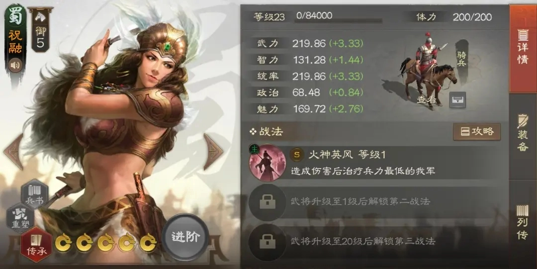 祝融常被安排在魏骑队中担任辅助,顶替的正是之前马腾的位置。输出方面可以选郭嘉,工具人则搭配贾诩/钟会、张郃与荀彧;祝融通常携带因粮于敌和奋武扬威,要是没有奋武扬威,随便带个光环技能也可以。
