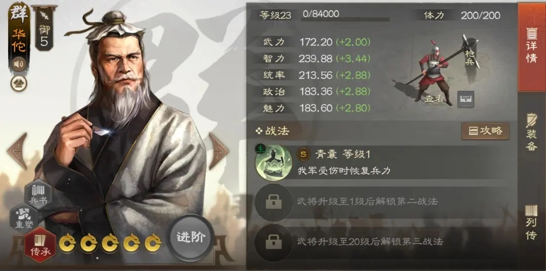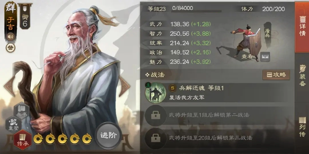 和华佗的作用相近,于吉同样是一位能提升队伍容错率的武将,他的复活技能堪称保人能力里的顶尖水准,哪怕队友被瞬间击败,也能让其重新回到战场。在搭配上,他也适合和奠基孙吴或者其他吴刀体系的武将组合,效果类似于之前于吉所在的群骑阵容。