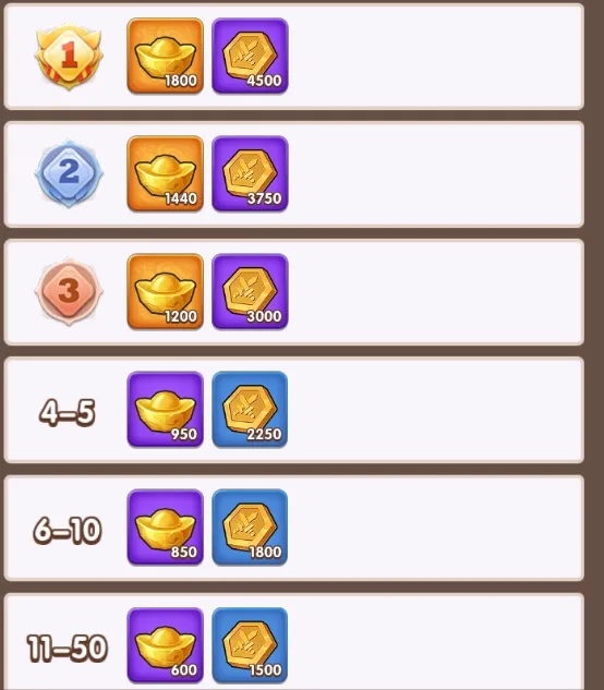 5)元宝购买次数的使用:比如排行奖励的分发是1)2)3)4-5)6-10)11-50)51-100)101-500)500+这样发,比如你在53名,在打一把就可以进50名,你就可以购买一次进个50名,多拿一点奖励。如果是400名,怎么样也进不去100名就没必要买了。