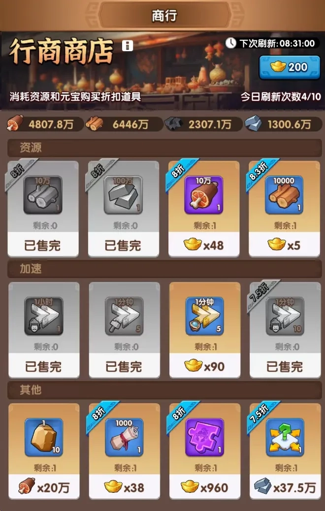 1)行商商店里所有有折扣的资源都要全部兑换,前期遇到能用资源兑换加速道具的情况都可以换,不过元宝兑换的基本就别考虑了,买有折扣的反侦察令牌是没问题的。