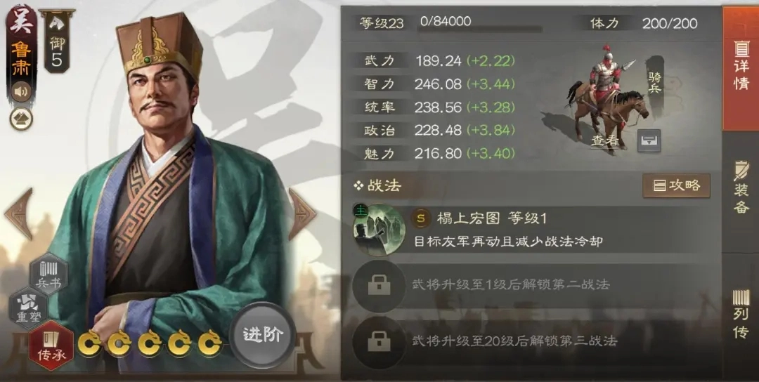 鲁肃是从开荒阶段就很好用的武将,他让队友获得额外行动机会的机制适配性很强,能和不少武将搭配。通常至少需要两个鲁肃,一个用来上阵,另一个则拆解战法“先礼后兵”。如果目前还没有鲁肃的话,可以考虑兑换一个。