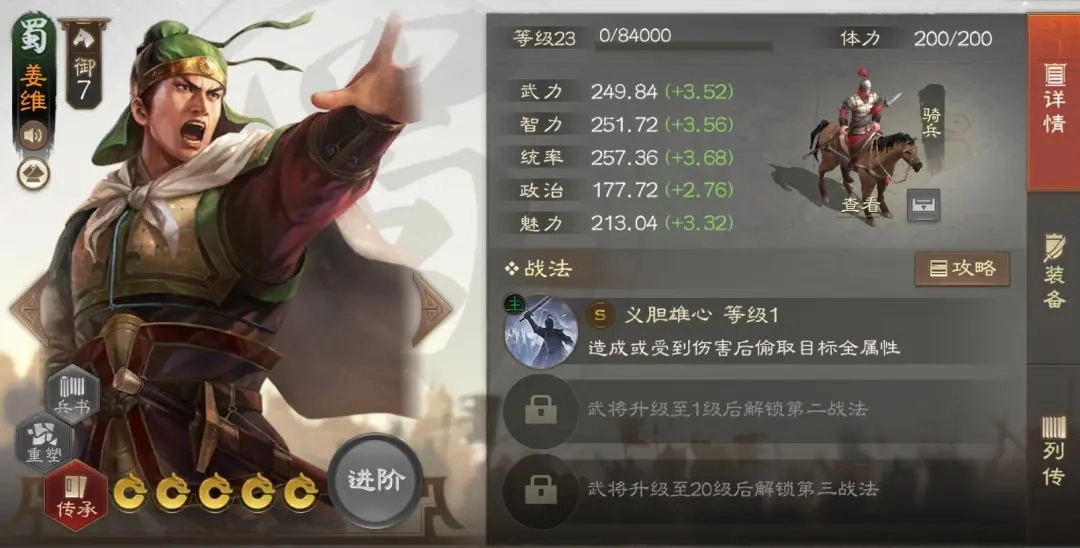 姜维作为蜀国后期的核心输出,如今在战场上依旧活跃。他是至少需要两张的武将,并且红度越高效果越好,要是你其他武将都已凑齐,不妨考虑提升姜维的红度。
