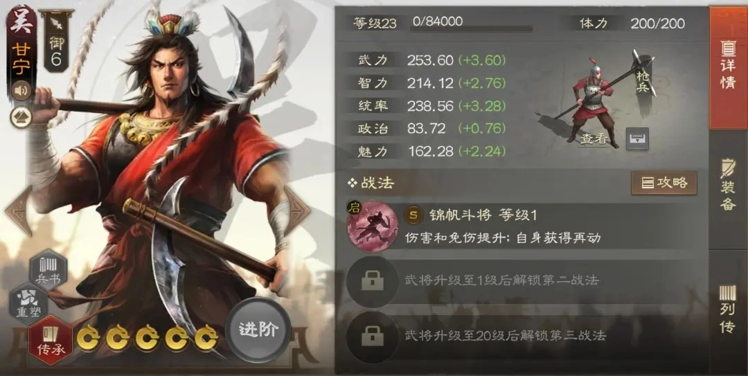 甘宁在更新了奠基孙吴的羁绊后,成为了一名具备实用性的武将,自身强度也颇为可观。无论是在天梯中表现强势的三皇春甘阵容,还是用于大世界的自动战斗场景,他都能发挥作用。建议至少获取一个,其拆解技能百骑劫营的强度同样不容小觑。