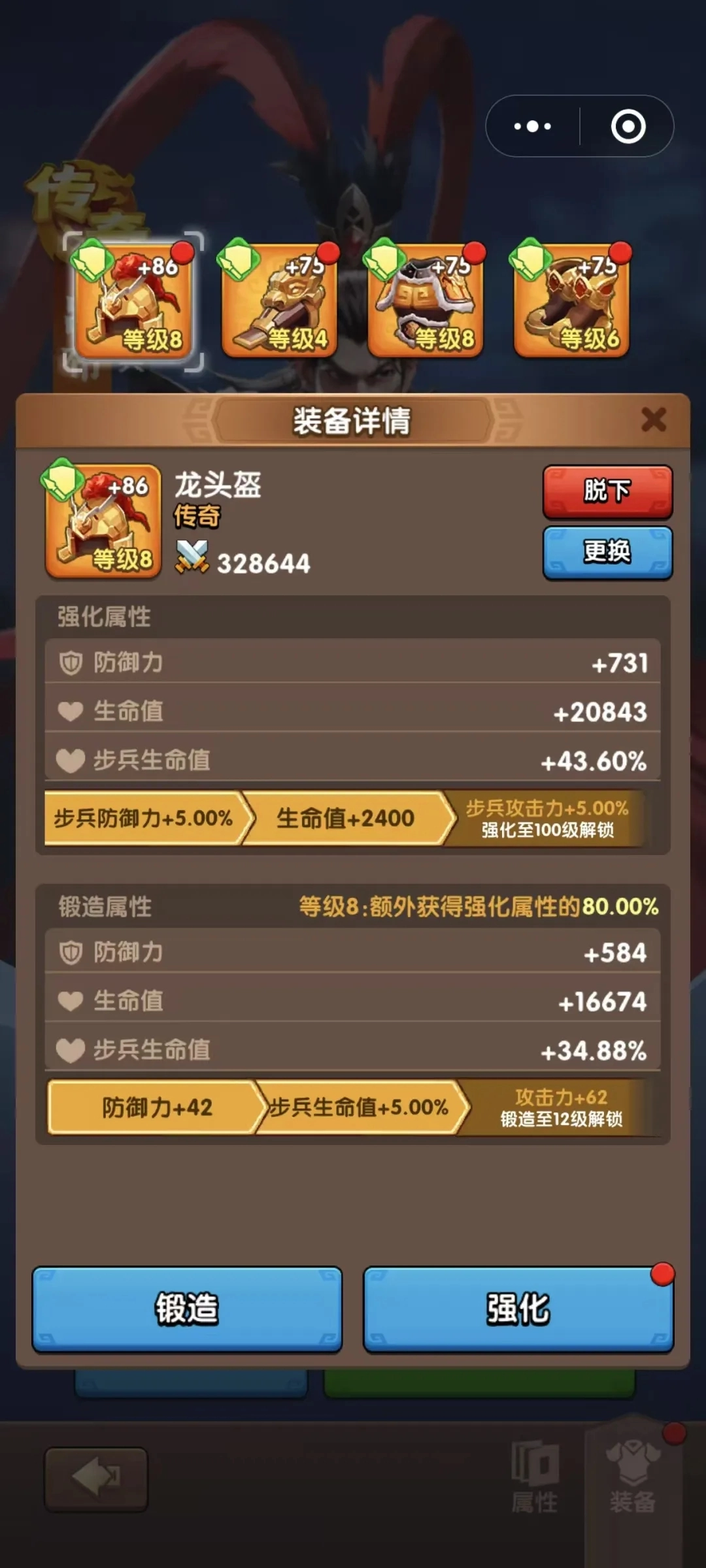 优先强化步兵武将的装备到50级,可以增加步兵防御力+20%。