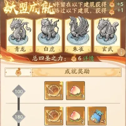 妖盟成就奖励规则如下:该成就需全体妖盟成员共同完成。当成员停留在四圣兽雕像前时,可为妖盟增加5点成就分;若只是路过雕像,则增加1点成就分。妖盟成就的奖励主要包含本源丹碎片、桃子以及传说级随机内丹碎片等。