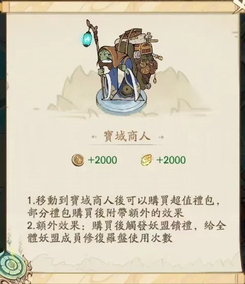 宝域商人的部分礼包购买后会触发额外效果,能为全妖盟成员恢复罗盘使用次数,具体恢复多少,就看妖盟里的大佬们是否给力啦。