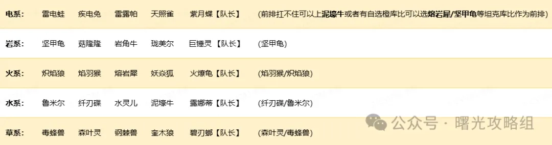 电系:天麒、雷露帕、疾电兔、妖焱狐,(前排可以再补充一只鲨鱼或者玄武)。