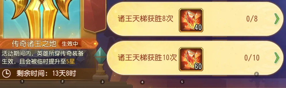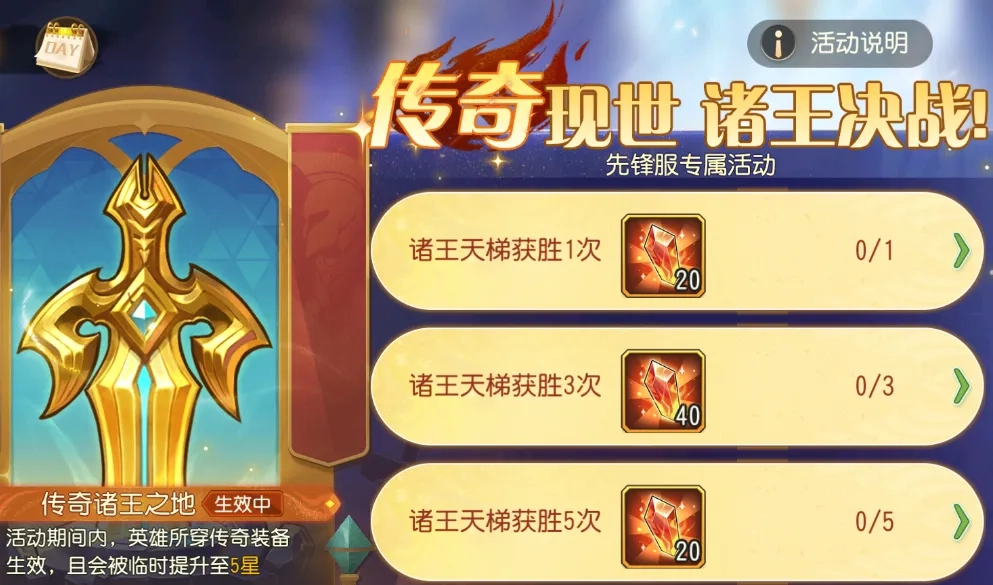 (3)活动进行期间,诸王争霸玩法中将出现特殊的场地效果——传奇诸王之地:英雄穿戴的传奇装备在该玩法里能够生效,并且会被临时升级到5星。