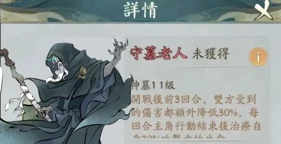 2、在最初的爆料里,守墓老人的技能效果是前三回合生效,不仅能让伤害额外降低30%,还会按攻击力的30%回复生命值!