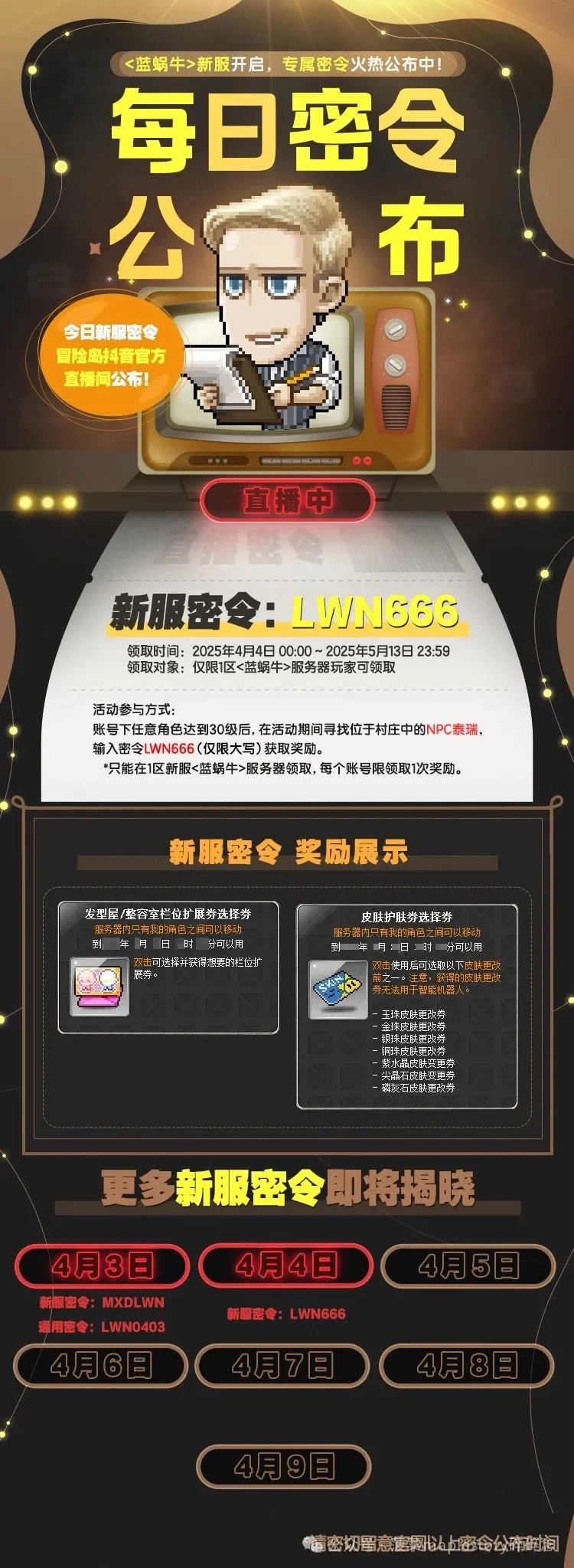 冒险岛蓝蜗牛新服密令兑换码礼包汇总