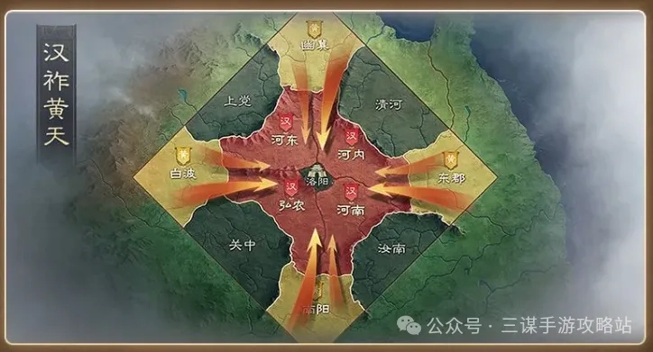 全新的地图布局中,汉室阵营被置于中心位置,黄巾阵营与资源州则分布在其四周。