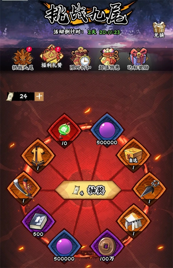 《挑战九尾》完成一轮=1个SSS自选+1个SSS+自选(8选1)+30高抽(挑战九尾),