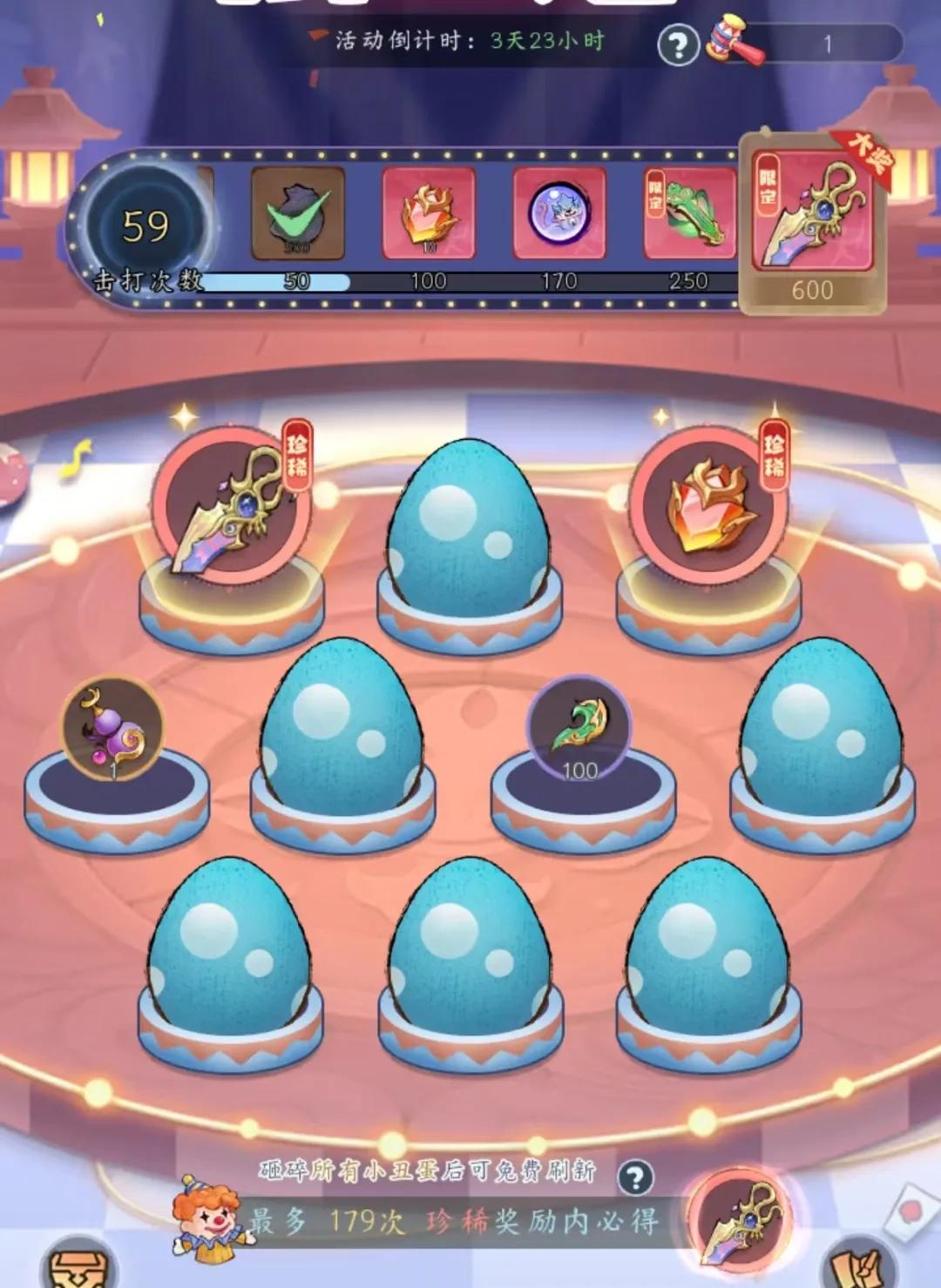 使用捣蛋锤敲击小丑蛋,有机会得到仙器愚神金蛟刃与法宝大谎言之音。小丑蛋包含金蛋、紫蛋、蓝蛋三种,其中只有金蛋和紫蛋能以一定概率产出仙器和法宝,所以我们只需敲这两种蛋就可以了。