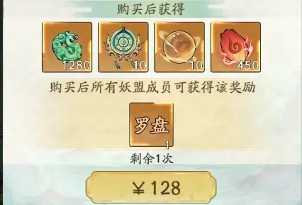 还有一个氪金重点,就是活动里的限时礼包!128档位购买后自己能得到10个罗盘,全妖盟还能恢复1点体力!这个礼包对想冲妖盟排名的玩家来说性价比最高了——假设妖盟有59人,买这个礼包就相当于总共恢复69点体力,妖盟整体能获益,个人得到的好处相对少点;但要是买的人多了,个人能拿到的好处也会挺不错!