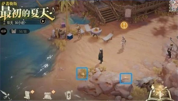 海边礁石的左侧草丛和右上角都有闪光点,与这两处互动后,能分别得到50钻和100海湾铜币。