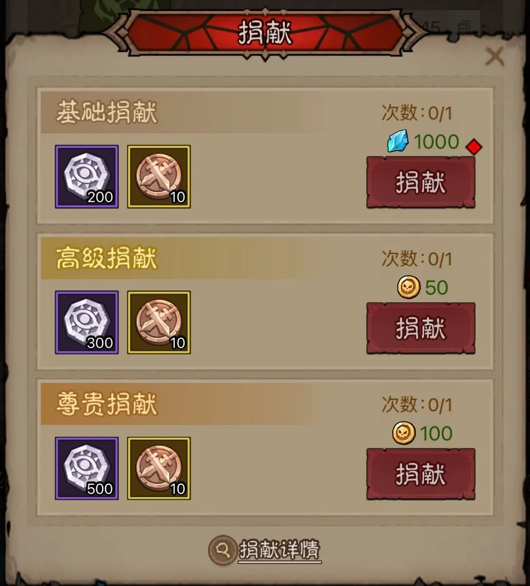 捐献分为基础捐献、高级捐献和尊贵捐献三种类型。其中,基础捐献需捐献1000奥数结晶,高级捐献需捐献50暗金币,尊贵捐献则需捐献100暗金币。每次进行捐献,都能获得10点公会经验。