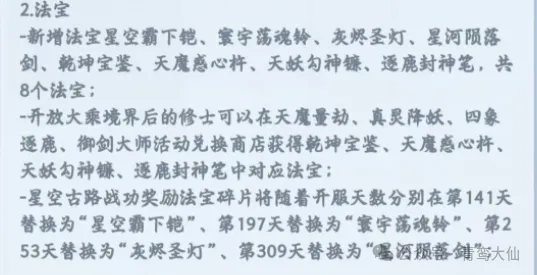本次更新推出了8款全新法宝,可通过天魔量劫、真灵降妖、四象逐鹿、御剑大师等大型活动兑换获取,大家不妨期待一下这些法宝的强度表现。