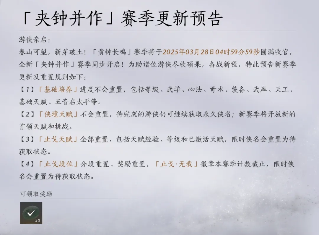 燕云十六声黄钟长鸣赛季将于2025年3月28日4时59分59秒结束,夹钟并作赛季随即开启!涉及玩家养成类的内容通常不会重置,像“一剑可当万师不绝版”“我即是江湖”这类称号也能继续使用!新赛季的更新及重置规则具体如下: