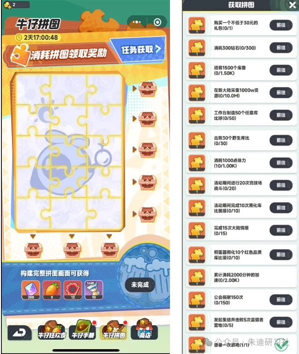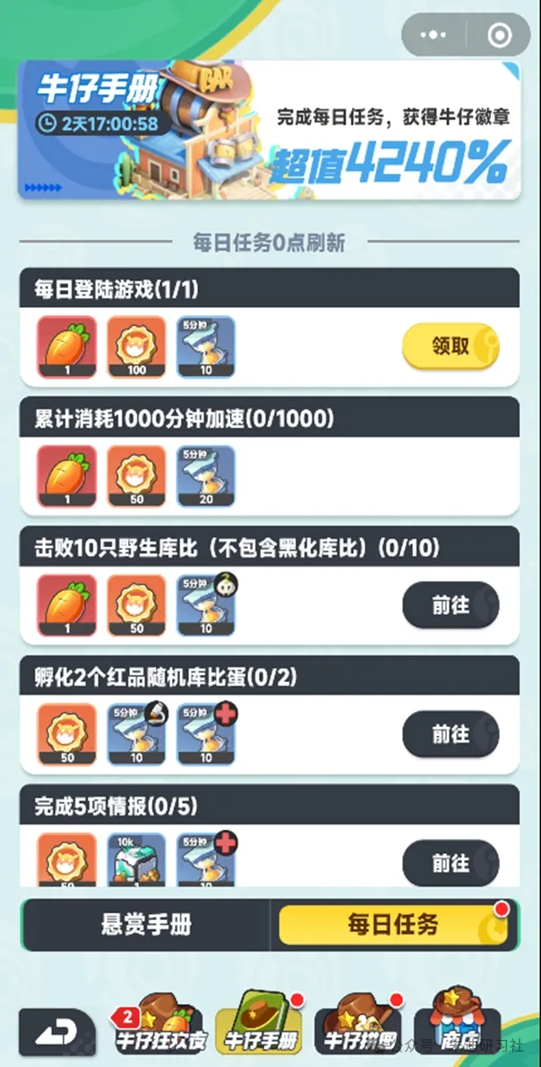 小编小贴士:后续的手册与拼图这两项活动,是零氪玩家获取胡萝卜的主要途径,同时也是牛仔狂欢活动道具的重要来源,大家尽量都参与,尤其是每日的登录、加速以及挑战野生库比这几项,千万不能错过!
