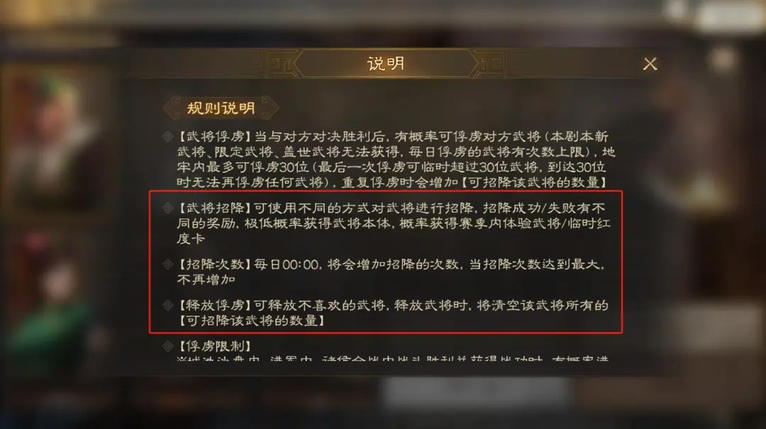 招降成功,概率获得赛季体验武将/临时进阶卡,即使你是满红也可以再加一红,但一个武将最多只能用一次临时进阶卡,赛季会重置。
