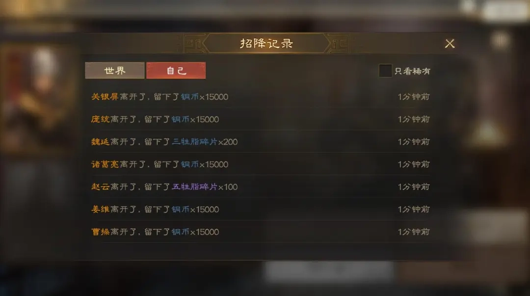 还会有极低概率获得武将本体,比如世界这里仅有的一条记录,获取了一个刘备。
