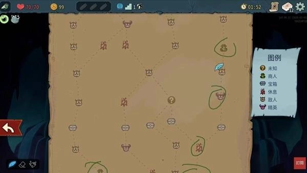 接下来是地图规划,也就是路径的选择方向。每一层开始时你就能在地图上看到整层塔的路线,我推荐的地点次序是:商店>未知地区>菁英怪。商店是稳定的删卡来源,而菁英怪会掉落强力卡牌和遗物,但相应地很可能让你的角色状态大幅下降,这是用血量来换取的资源。