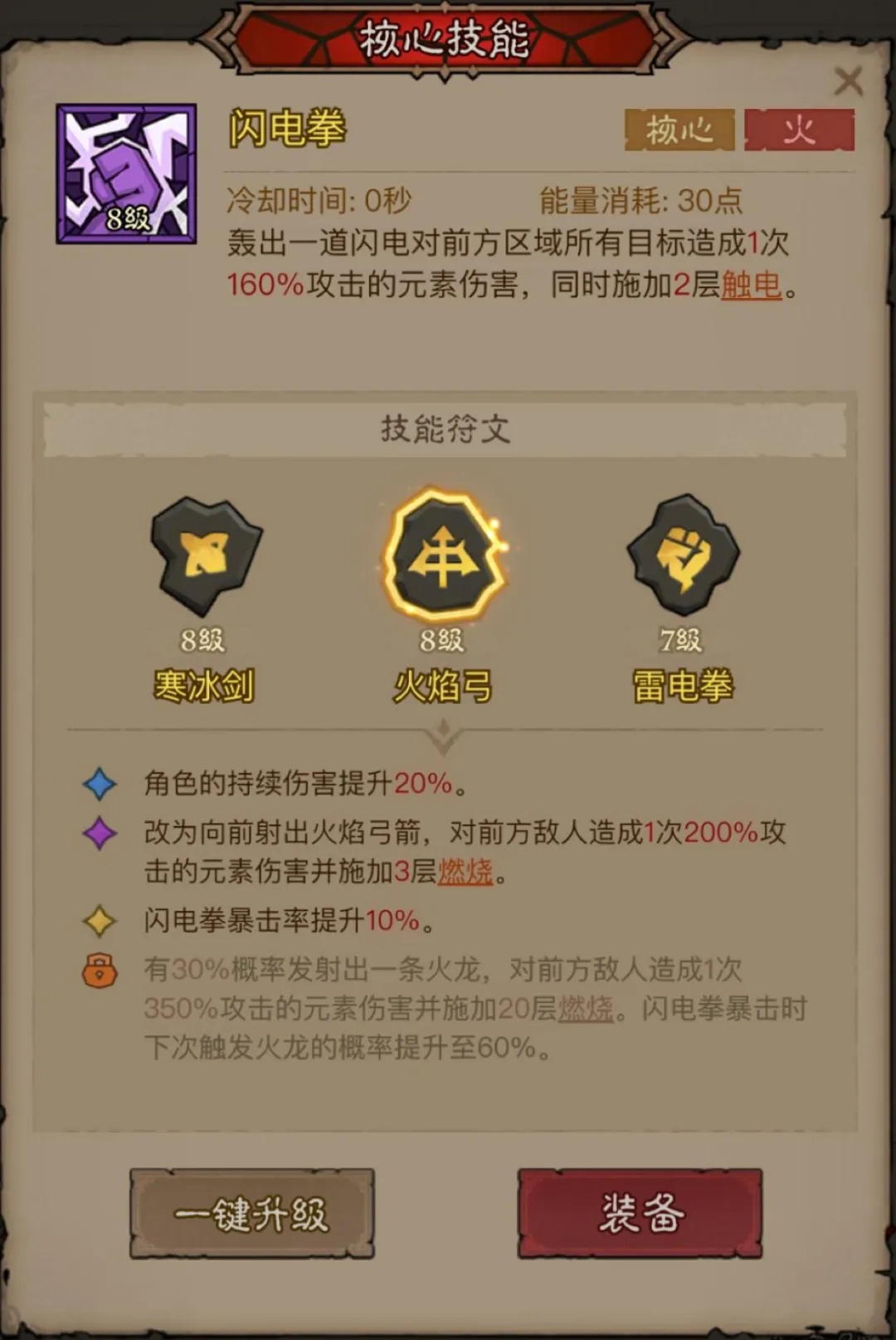 核心技能:闪电拳、火焰弓
