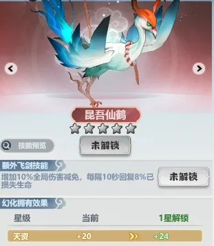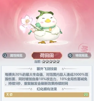 飞剑技能:每当自身损失最大生命值的20%时,会对范围内的敌人造成2000%的范围伤害,与此同时自身攻击力提升10%,全局伤害减免效果增加10%,该效果持续5秒;若重复触发此技能,效果的持续时间将被刷新。