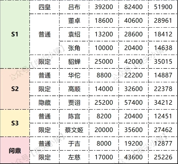 张角、袁绍、董卓作为S1赛季的元老级将领,只要没有急功近利把他们当狗粮吃掉,基本都能满星,而且进阶后强度也依然在线。