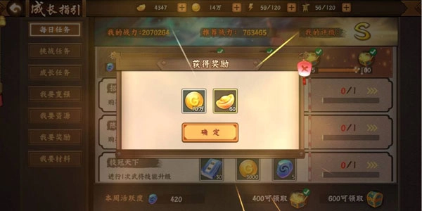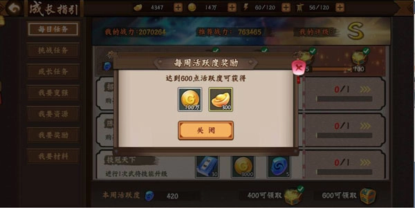 与此同时也会积累一周的活跃度,当一周的活跃度达到400和600时便可领取150元宝和300元宝的奖励,