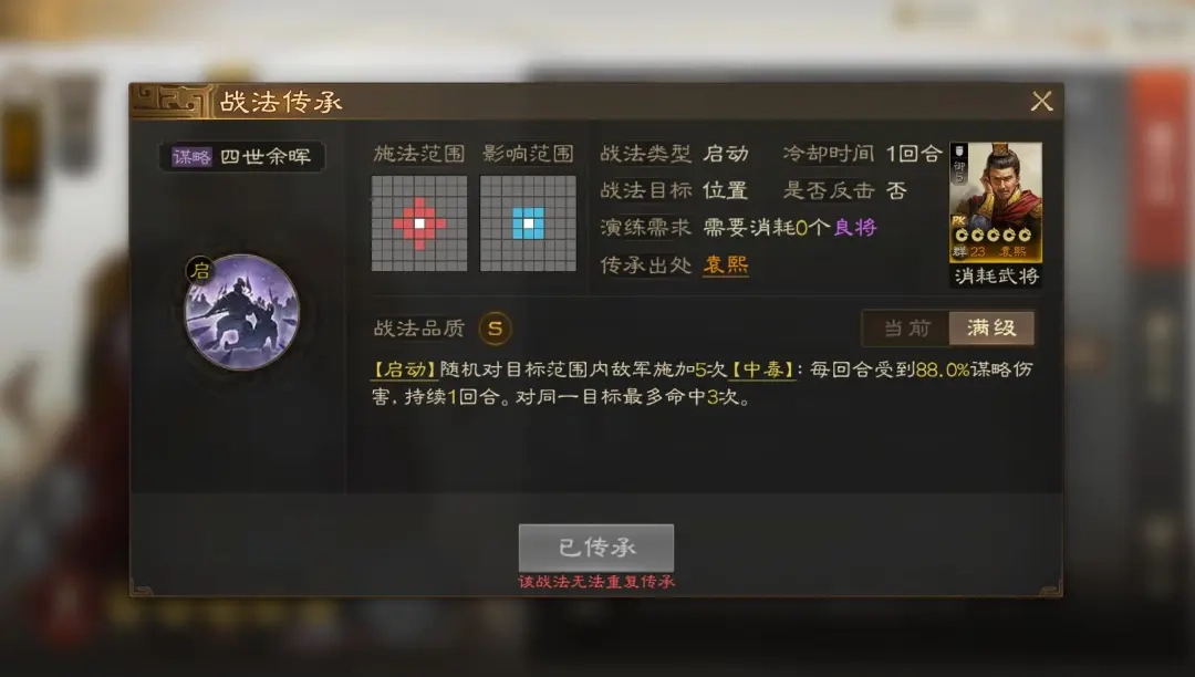 不过四世余晖目前的伤害总倍率有所提升,打满的话就是88%乘以5等于440%,所以对周瑜和程昱而言,这个战法还算能用,只是无法触发被动效果了,并且得等回合结束结算后才能造成伤害。