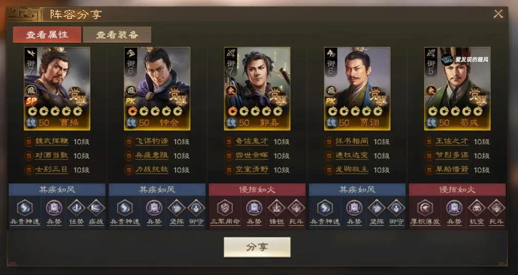 郭嘉搭配四世余晖与空室清野,兵书选用三军用命,核心围绕DOT流输出,SP曹操负责单点突破。若没有双SP曹操的配置,也可调整为SP曹操携带士别三日和四世余晖,郭嘉则搭配遁甲天书与环环相扣;这种组合能让SP曹操较快叠加被动,应对多数队伍时表现尚可,但遇到满红孙尚香会比较棘手——由于SP曹操无法秒杀对方,很容易被反击反杀。