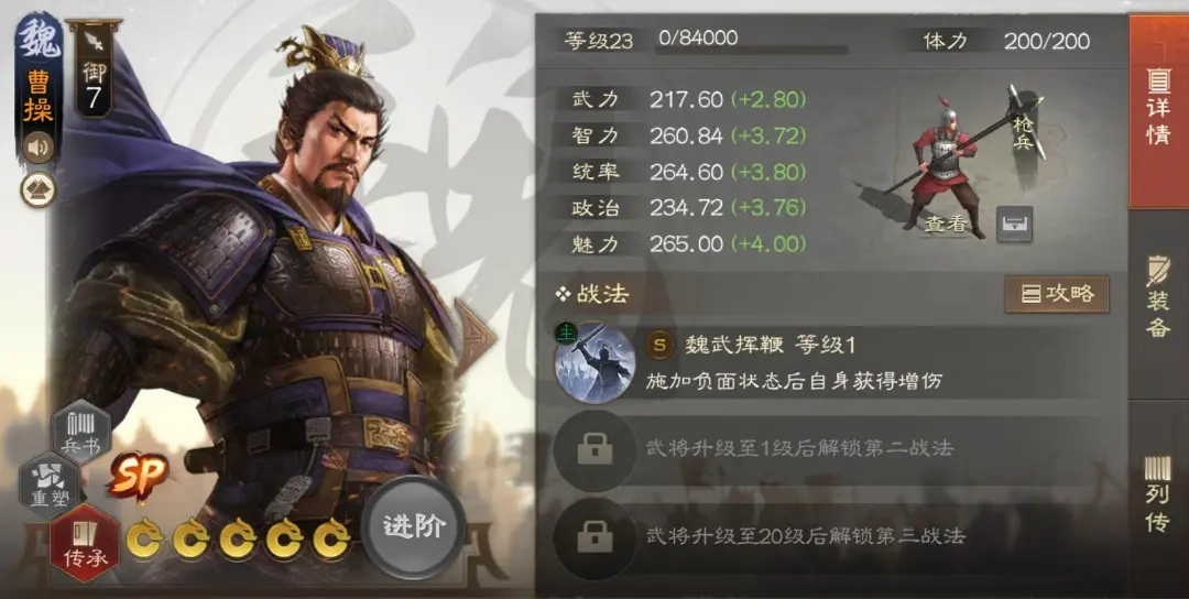 最后来说SP曹操,由于他的被动效果是施加负面状态就能提升伤害,所以四世余晖带来的中毒效果同样能为SP曹操增加伤害,而且四世余晖属于启动类战法,能够实现先触发增伤效果,再释放另一个战法的作用。通常情况下,要是SP曹操携带四世余晖,那么另一个战法往往会搭配士别三日或者环环相扣。