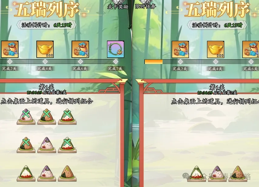 2、【五端列序】活动需消耗端午方粽进行排列,当前处于第一关,仅需3个粽子,后续关卡所需数量暂不明确。端午方粽可通过每日限时任务获取。