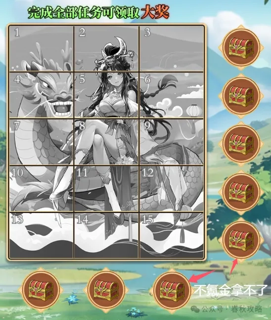4、【续缕延年】完成拼图任务可获得天师符与八宝香粽,不过需要注意的是,任务15需氪金100元才能完成,因此与其关联的奖励无法获取。经核算,不氪金的玩家能拿到23个天师符,而氪金玩家则可获得32个天师符以及2个八宝香粽。
