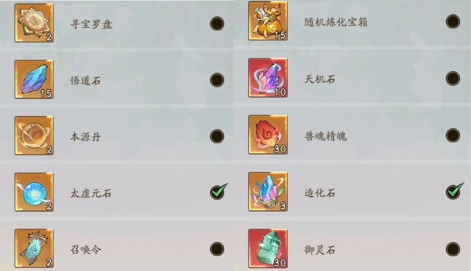 自选道具有两种类型。如果法则系统尚未开启至尊法则,建议优先选择悟道石;若已开启,则可以选太虚元石用于抽取玄诀轮回。第二类自选道具,建议选择造化石来提升小世界等级,毕竟小世界等级提升后,也能增加增减伤这类重要属性。
