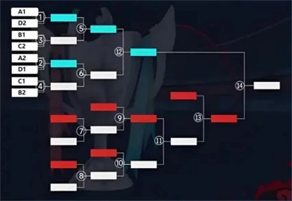 晋级赛第二阶段(16进8):(6) 此阶段实行积分循环赛制,赛事分为4个小组,每组包含4支战队,比赛为3局2胜制,获胜队伍得3分,平局各得1分,失败不得分,每组排名前2的战队进入下一轮比赛。