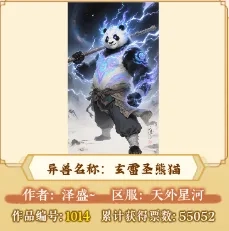 票数排名第二的是玄雷圣熊猫,它以国宝大熊猫为原型设计,外形还和英雄联盟里的雷霆咆哮沃利贝尔有几分相似。和现实中熊猫的可爱形象不同,它给人一种强烈的压迫感,凶悍的气质直接拉满。关于技能,这位修士只提到了名字,没说明具体属性,但小花猜测,如果官方要推出这个角色,技能应该会和暴击率有关联——毕竟建模里有闪电元素,它是雷系异兽嘛。