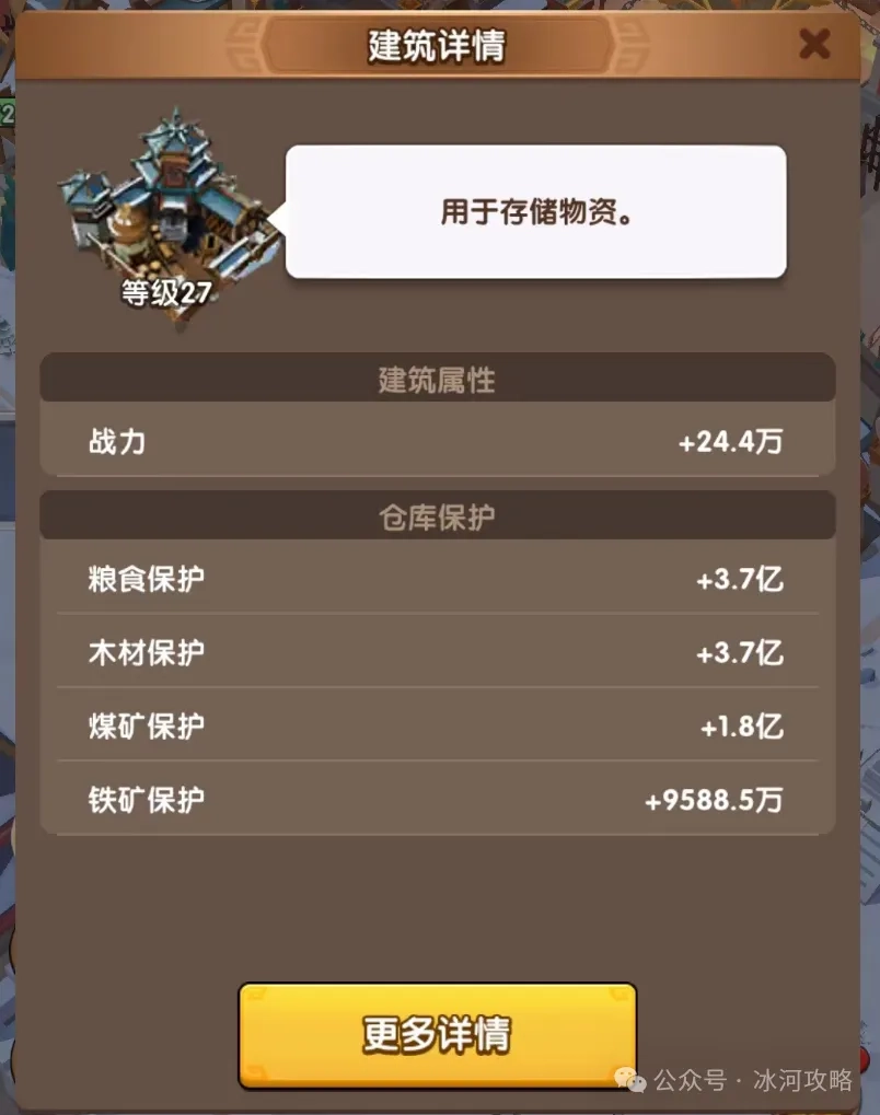 总仓库保护资源:点击城内的仓库建筑,进入详情页面,就能看到自己总的资源保护量。