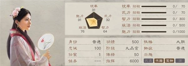 五维属性表现平平,不过91点的魅力值比另一位以魅力见长的妻子还要高出一截;自带的战法包含3级鼓舞与2级治疗效果,作为辅助角色算是合格水准,更难得的是拥有极为稀有的落雷技能,整体来看确实具备一定价值。