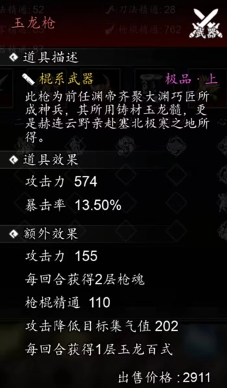 专属武器【玉龙枪】每回合提供1层【玉龙百式】,2层【枪魂】。