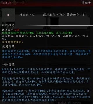 10级效果【玉龙酣战】的特性是生命值越低,自身的生存能力和输出能力就越强。此外,触发闪避时的增益效果也十分强力,因此建议尽量采取【背击】的方式来提升命中率。