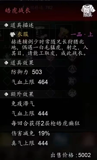 专属衣服【皓虎战衣】每回合提供2层【皓虎癫狂】,还免疫【滞气】。