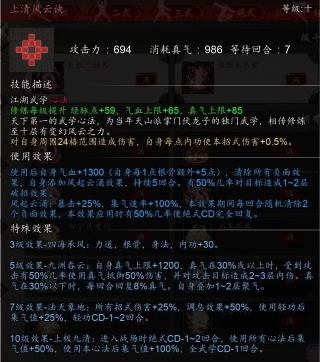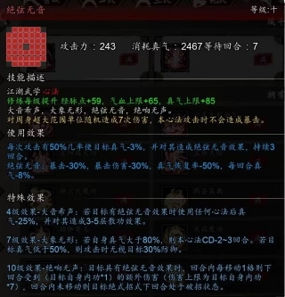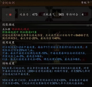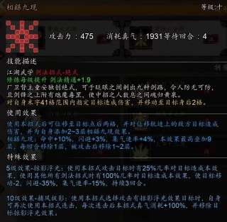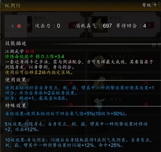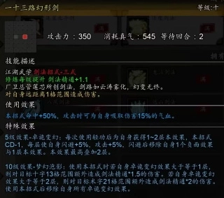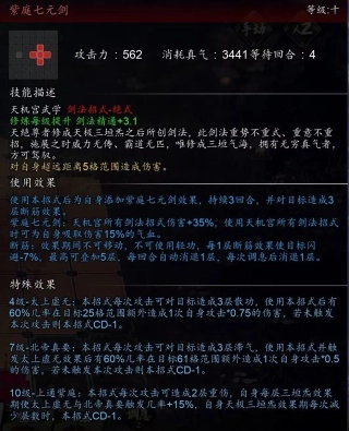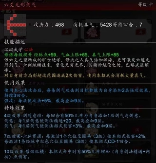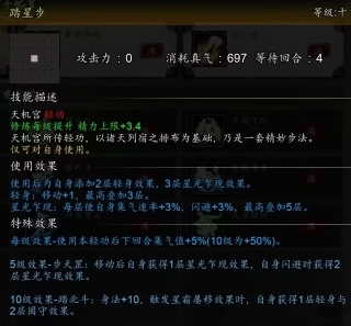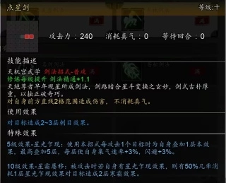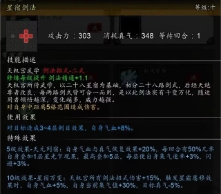 10级效果可使所有天机剑法招式增伤,触发【点星剑】10级效果【星霜屡移】时自己加血加集气值,还给目标减真气。