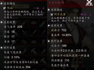 因为天机剑法常常要扎进人堆里靠闪避减星宿幻冷却,所以7级效果的受背击侧击时加集气非常搭配,并且由于天机剑法的高机动性,自身背击侧击加强暴击,也是非常搭配。