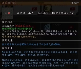 核心是【摇光为始】效果,其本身能减攻击、命中和移动力。5级效果可以让使用任意天机剑法招式均造成【摇光为始】