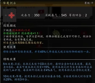 虽然一般用【连星北斗剑】,但是降魔剑法在打一些困难BOSS有奇效,可以使目标暴击为0,降低招式伤害25%。使用本招时可以等5级效果【卫道】叠满了用。