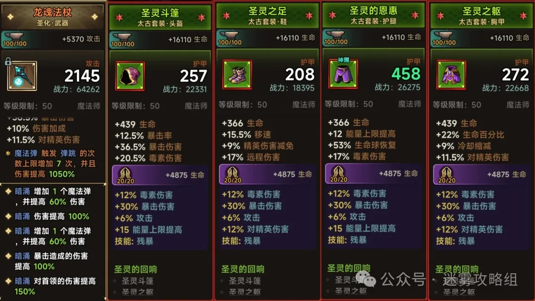 圣灵四件套由头盔、鞋子、护腿和胸甲组成,能提升基础技能(普攻)的伤害;圣化武器龙魂法杖可触发7次弹跳效果,圣化词条选五暗涌,不过不一定非要凑齐5个,2个的强度也相当不错;手套选蓄势待发,能量上限越高伤害加成越明显;副手搭配祝祷,能增加暴击伤害;项链用紫晖,可提升秒伤;护肩选择灵风,能提高攻速;戒指戴噬魔,能增加毒素伤害;神铸方面建议选残暴,当暴击伤害超过400时,每高出6%就会获得大量伤害加成;装备词条的洗练优先级要记住,优先考虑暴击伤害、暴击率、元素伤害和能量上限。